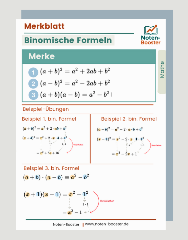 Die Binomischen Formeln gehören zu den wichtigsten Grundlagen in der Algebra und sind in vielen Klassenarbeiten ein echter Knackpunkt. Auf dieser Seite findest du einfache Erklärungen, klare Beispiele und ein kostenloses Merkblatt, das Schüler optimal unterstützt.